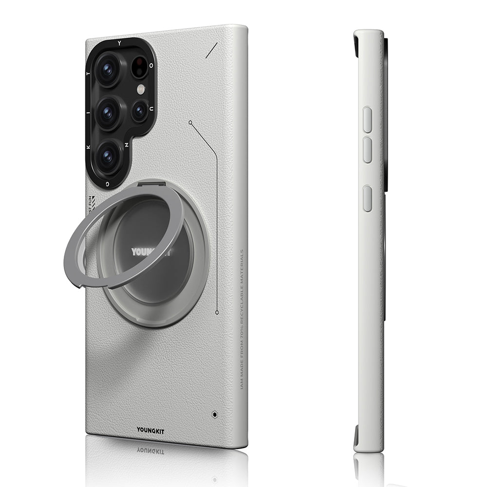 Galaxy S23 Ultra Kılıf M-safe Şarj Özellikli 360° Standlı Basit Mat Deri Desenli Youngkit Tech Leather Serisi Kapak Gri