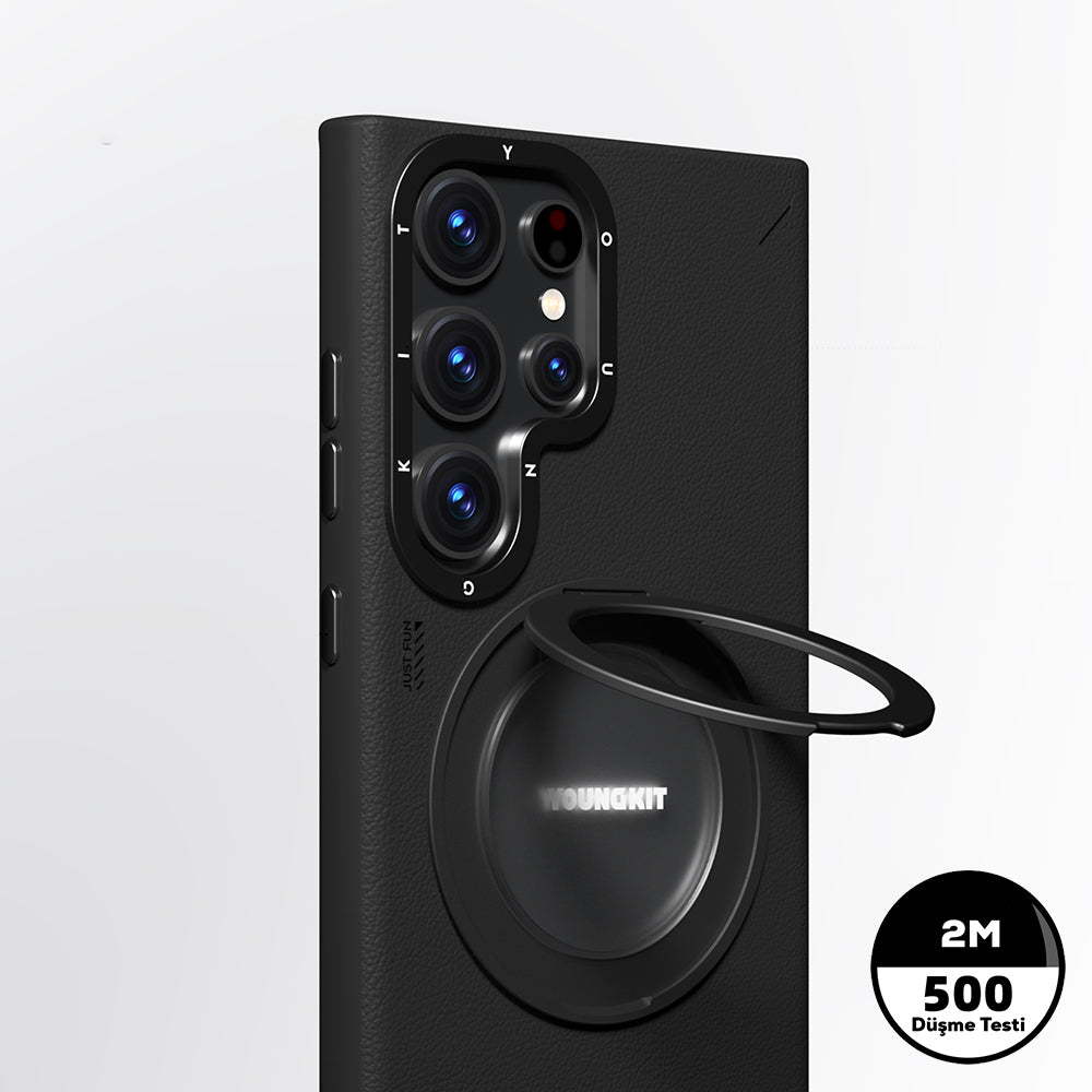 Galaxy S23 Ultra Kılıf Magsafe Şarj Özellikli 360° Standlı Basit Mat Deri Desenli Youngkit Tech Leather Serisi Kapak