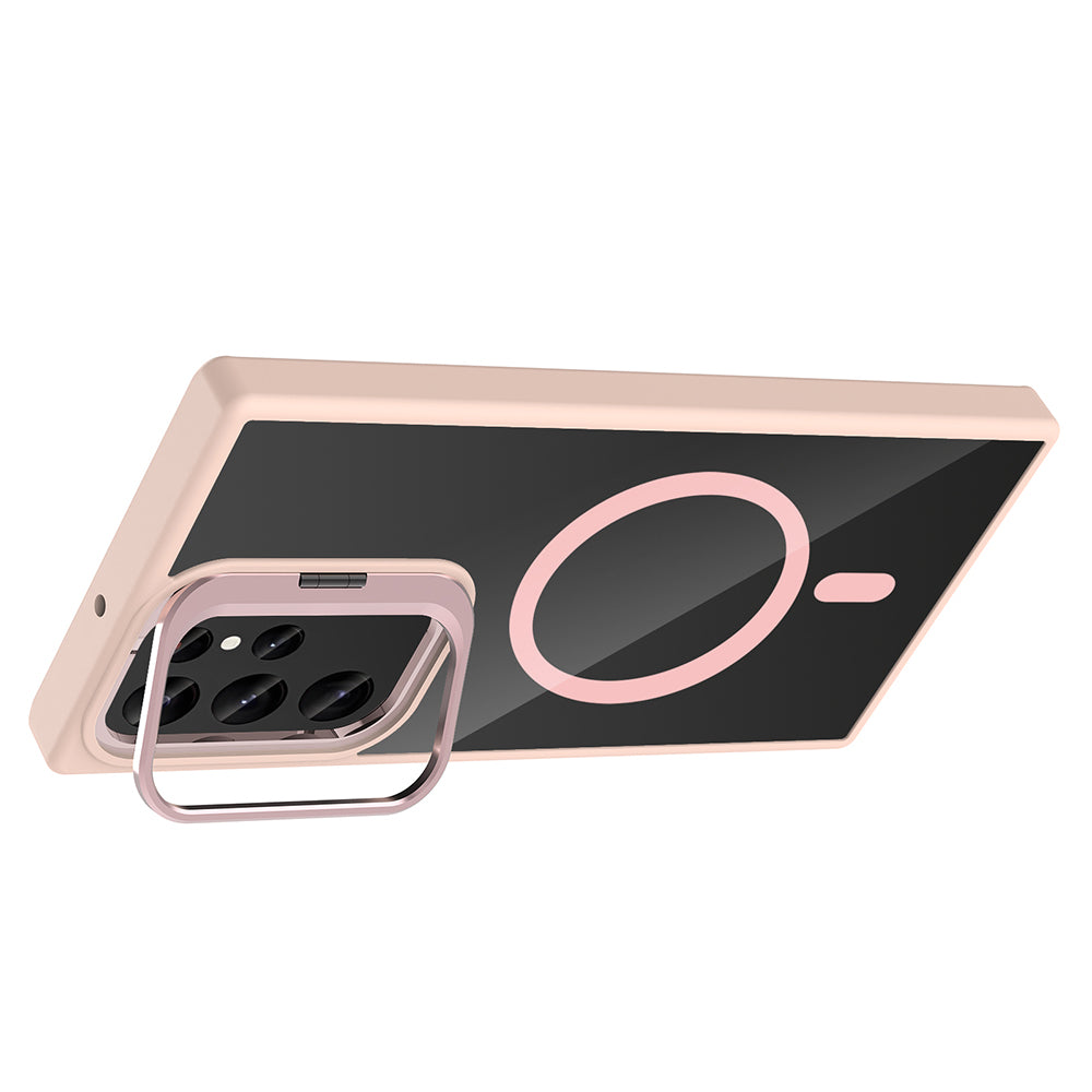 Galaxy S23 Ultra Kılıf Standlı ve Kamera Lens Hediyeli M-Safe Şarj Özellikli Zore Etro Kapak Pembe