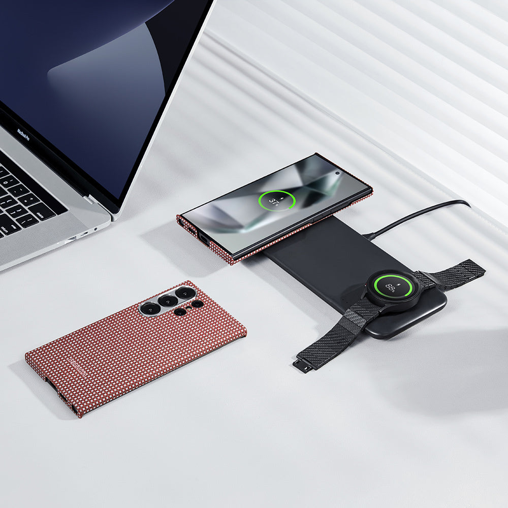 Galaxy S24 Ultra Kılıf M-safe Şarj Özellikli 1500D Aramid Fiber Pitaka Ultra-Slim Classic Serisi Bonfire Kapak Kırmızı