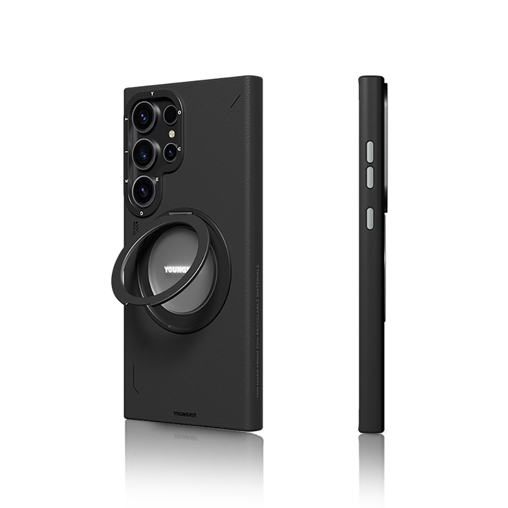 Galaxy S24 Ultra Kılıf M-safe Şarj Özellikli 360° Standlı Basit Mat Deri Desenli Youngkit Tech Leather Serisi Kapak Siyah