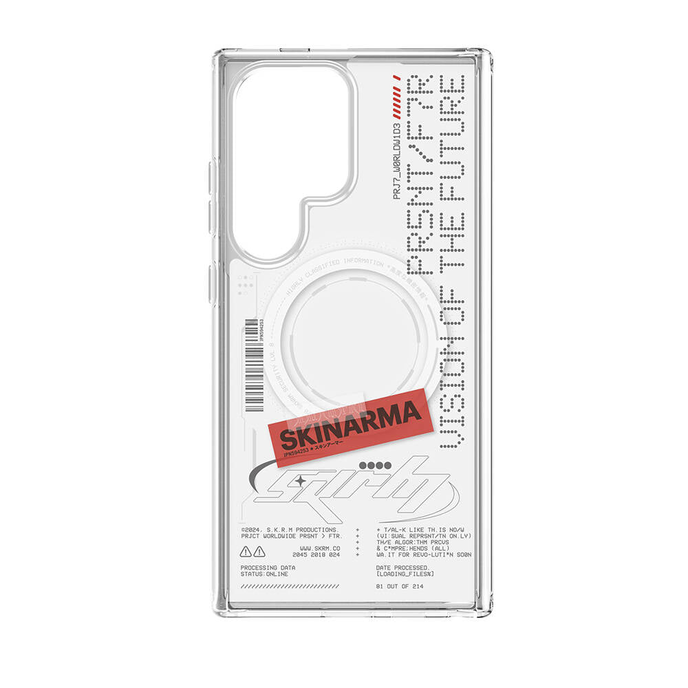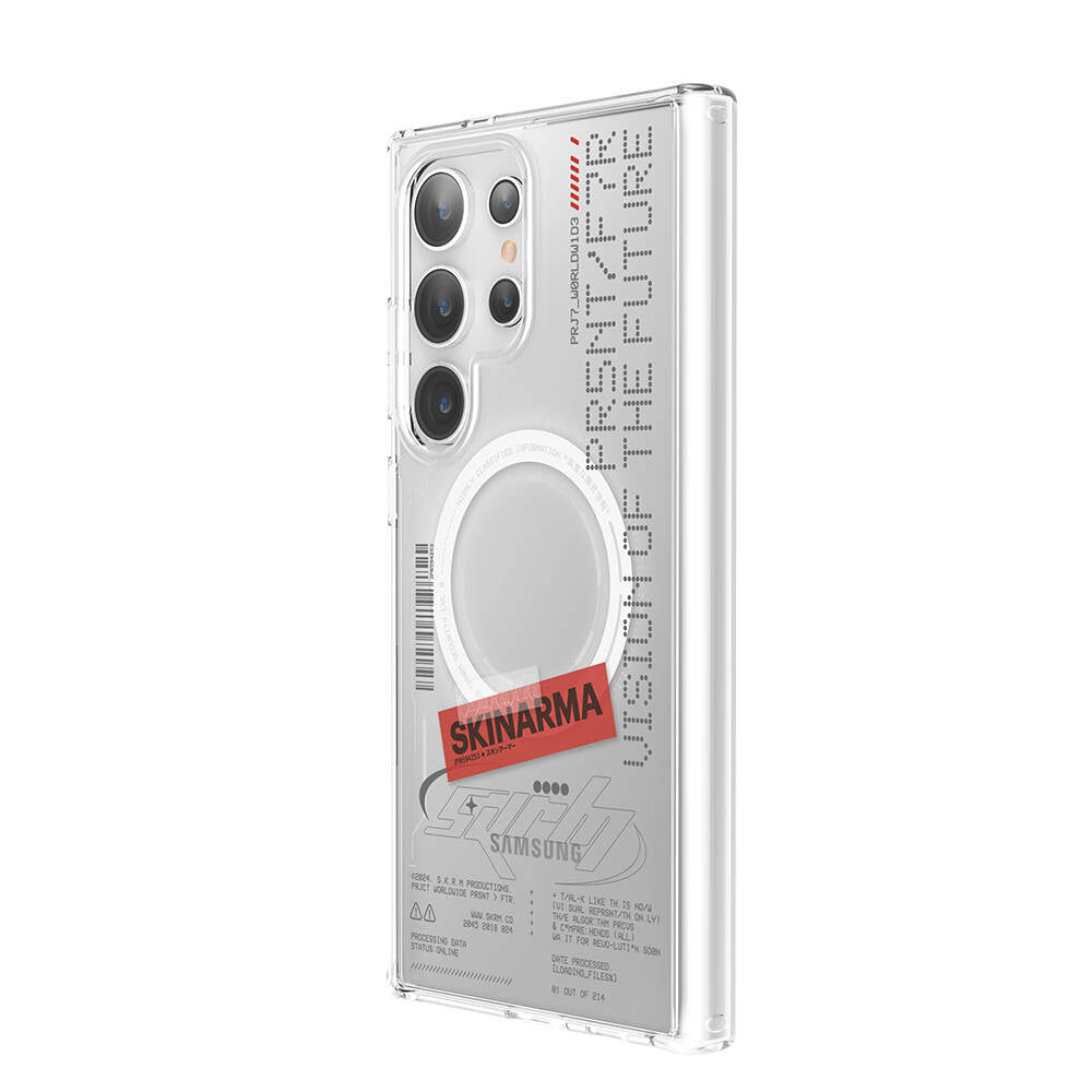 Galaxy S24 Ultra Kılıf SkinArma M-safe Şarj Özellikli Yazı Desenli Airbag Tasarımlı Orion Kapak Renksiz