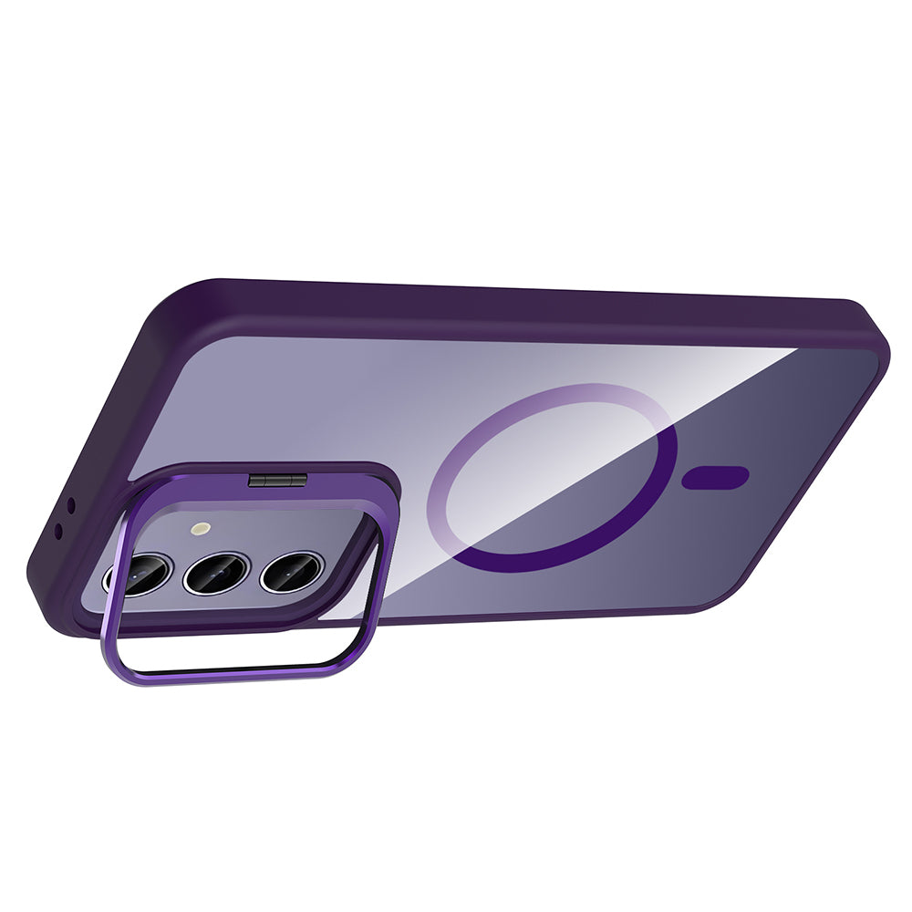 Galaxy S25 Plus Kılıf Standlı ve Kamera Lens Hediyeli M-Safe Şarj Özellikli Zore Etro Kapak Derin Mor