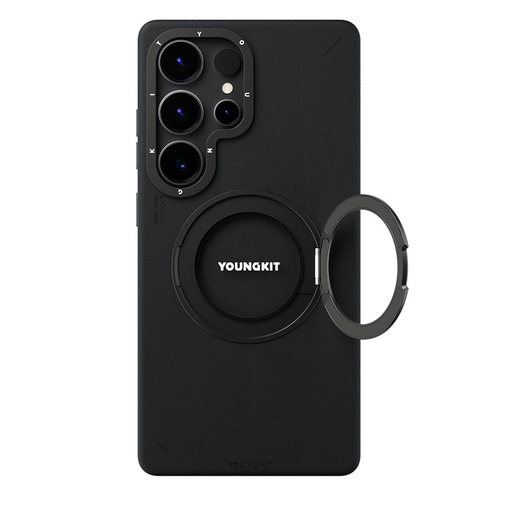 Galaxy S25 Ultra Kılıf M-safe Şarj Özellikli 360° Standlı Basit Mat Deri Desenli Youngkit Tech Leather Serisi Kapak Siyah
