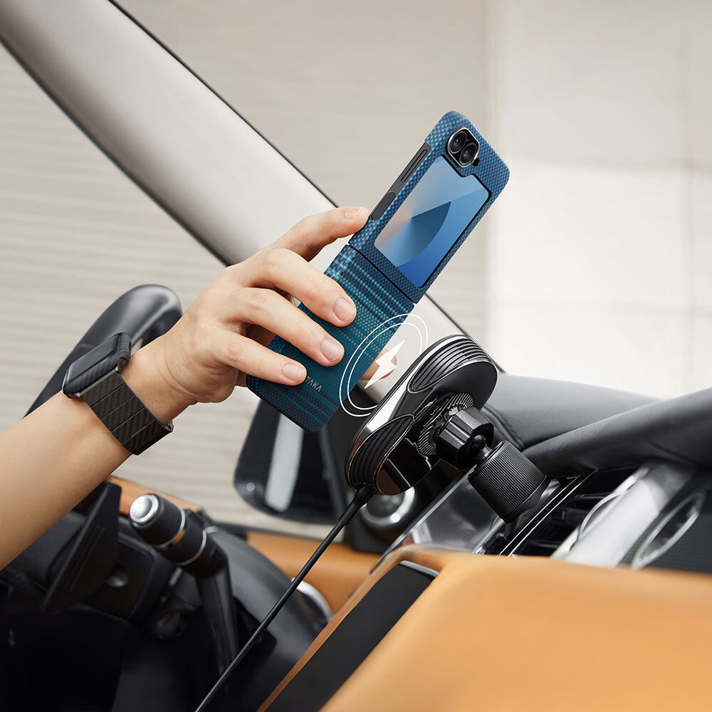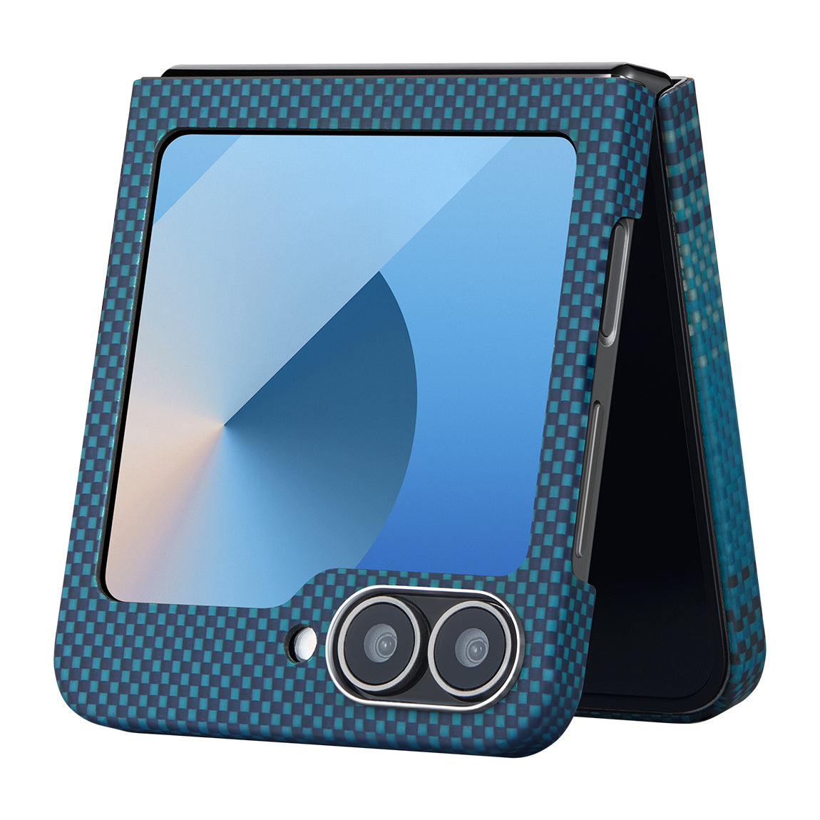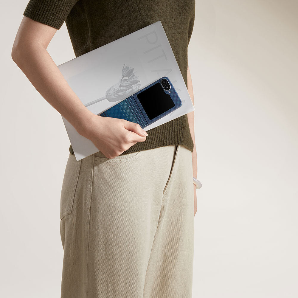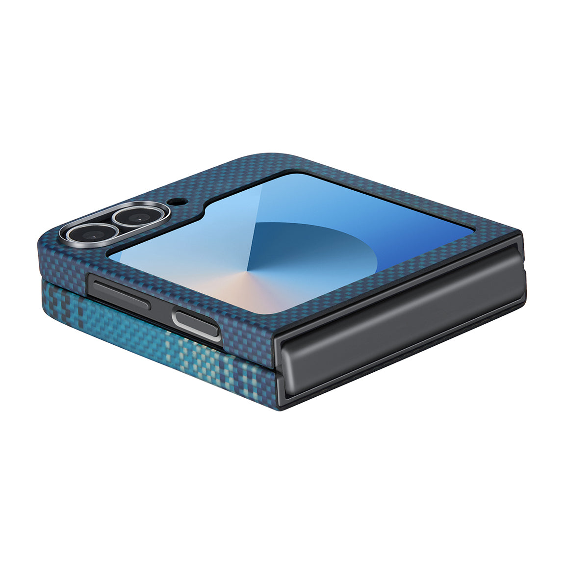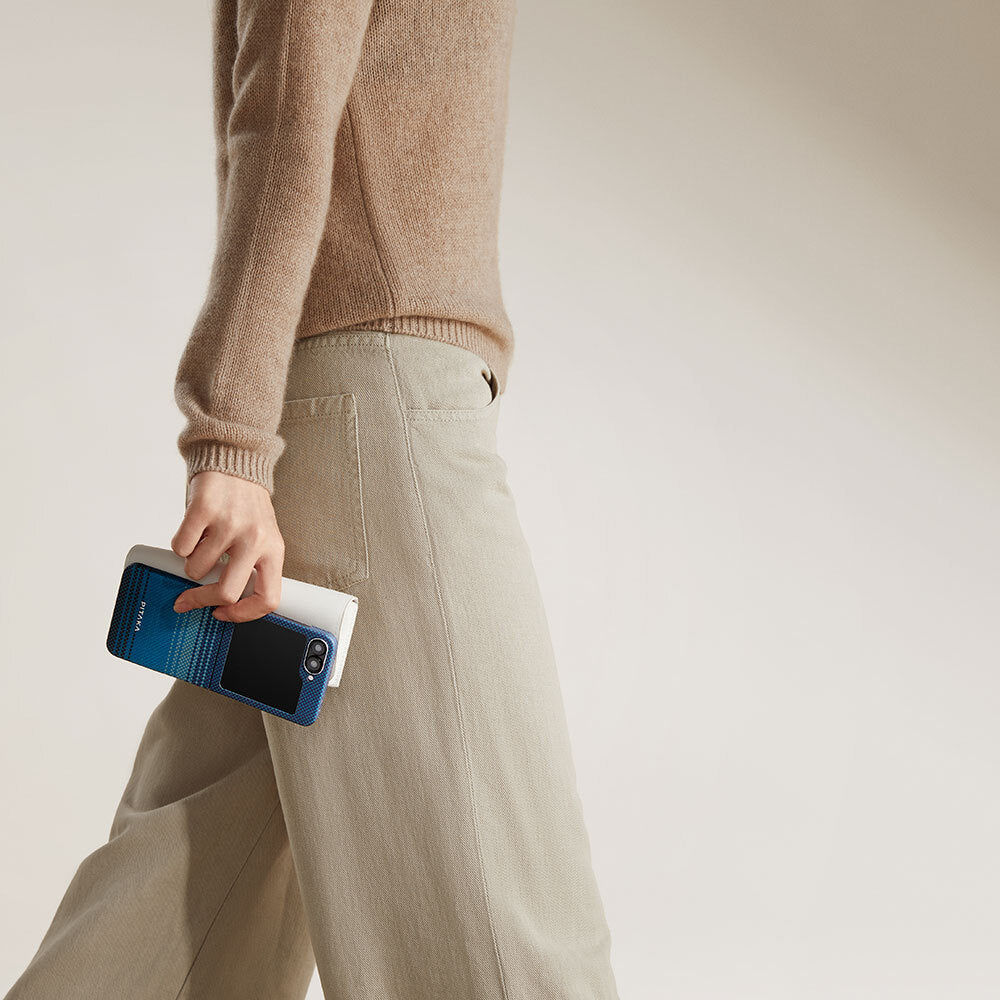 Galaxy Z Flip 6 Kılıf M-safe Şarj Özellikli Aramid Fiber Pitaka Tactile Woven Sunset-Moonrise Serisi Moonrise Kapak Mavi