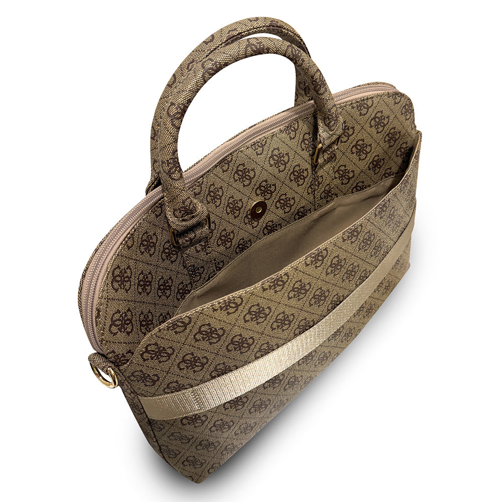Guess Orjinal Lisanslı 4G Desenli Üçgen Logolu Omuz Askılı 15 inç Laptop Çantası Kahverengi