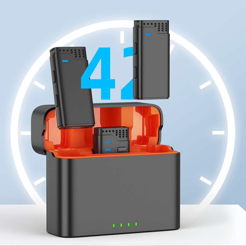 Mikrofon başına 6 saat, şarj kutusu ile toplamda 42 saate varan çalışma süresiyle gün boyu kesintisiz kullanım sağlar. 800mAh kapasiteli şarj kutusu aynı anda iki mikrofonu da taşıyabilir ve şarj edebilir. Hafif ve ergonomik tasarımıyla ister lavalier ister elde kullanım için uygundur.
