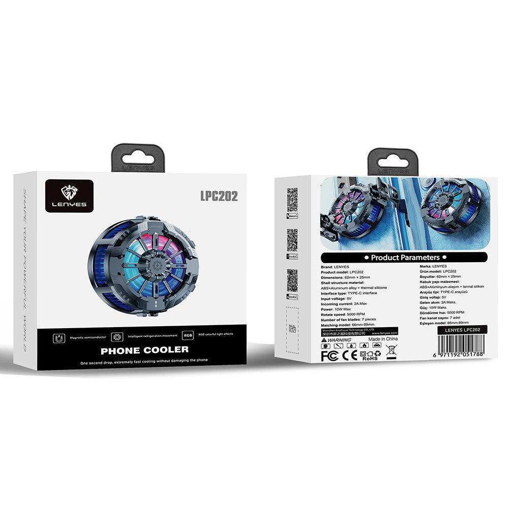 Yüksek kaliteli ABS, alüminyum alaşım ve termal silikon malzemelerle üretilen LPC202, hem dayanıklıdır hem de hafif bir tasarıma sahiptir. 62mm x 25mm boyutlarıyla kompakt olan bu soğutucu, cihazınızı zahmetsizce serin tutar. TYPE-C bağlantı ile kolayca şarj edilir ve 10W güç tüketimiyle verimli soğutma sağlar.