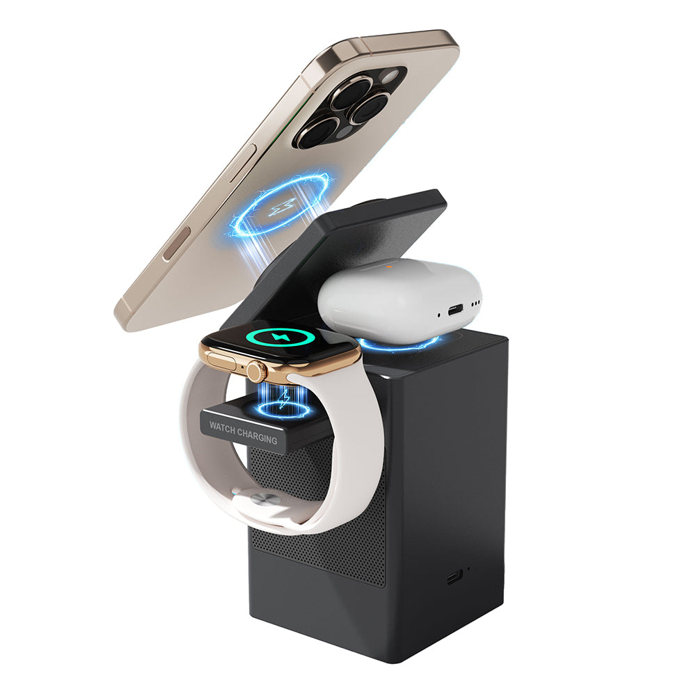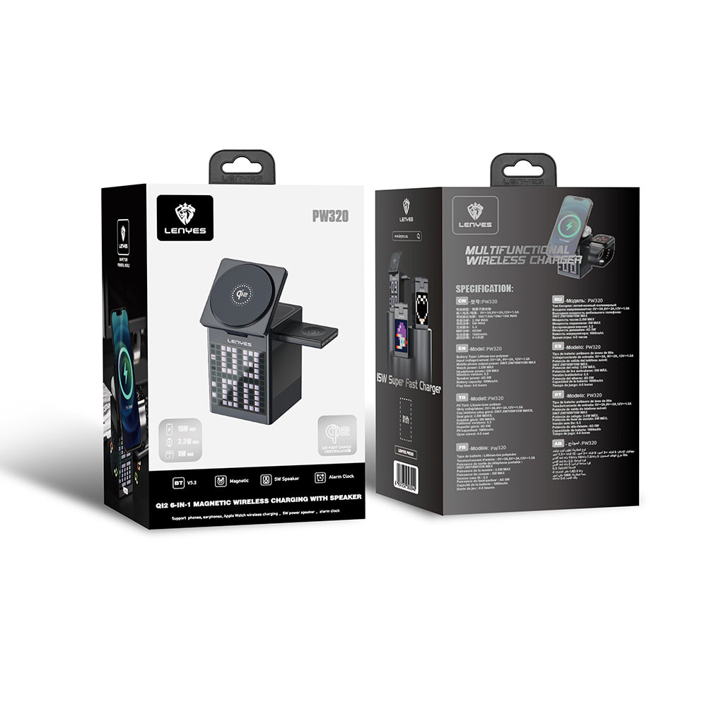Lenyes PW320 Qi2 Şarj Teknolojili Alarmlı Bluetooth Speaker Özellikli Telefon&Akıllı Saat&Kulaklık 15W 6in1 Kablosuz Şarj Standı