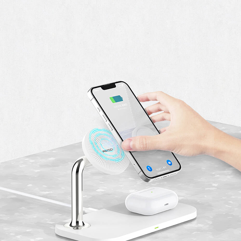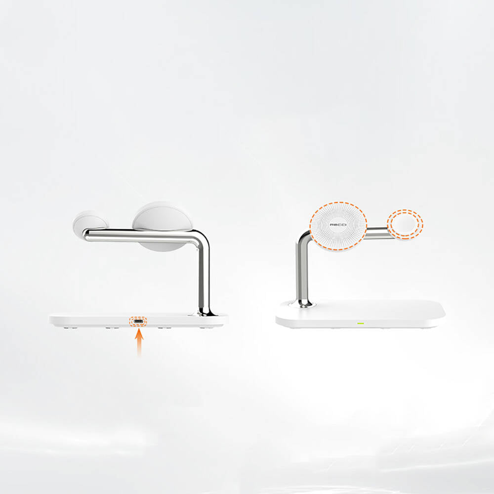 Recci RCW-20 Prestige Serisi 3in1 M-safe 15W Hızlı Şarj Özellikli Magnetik Kablosuz Şarj Standı Beyaz