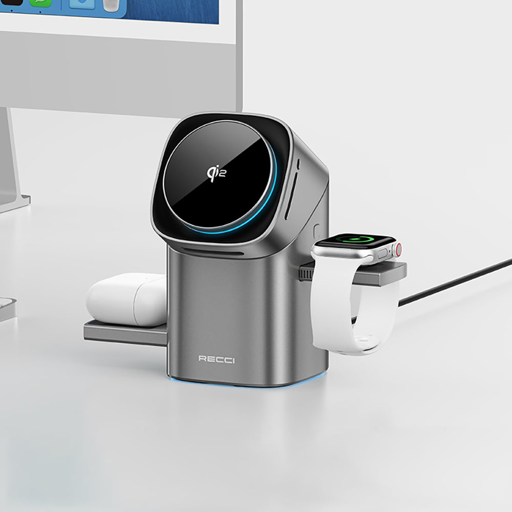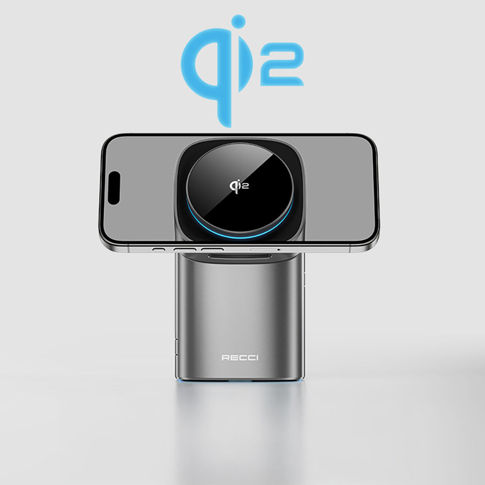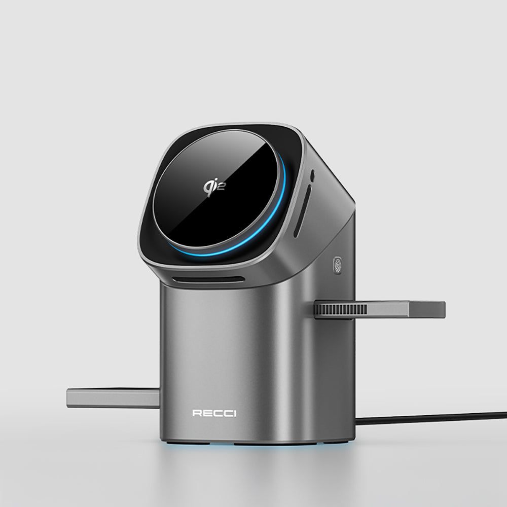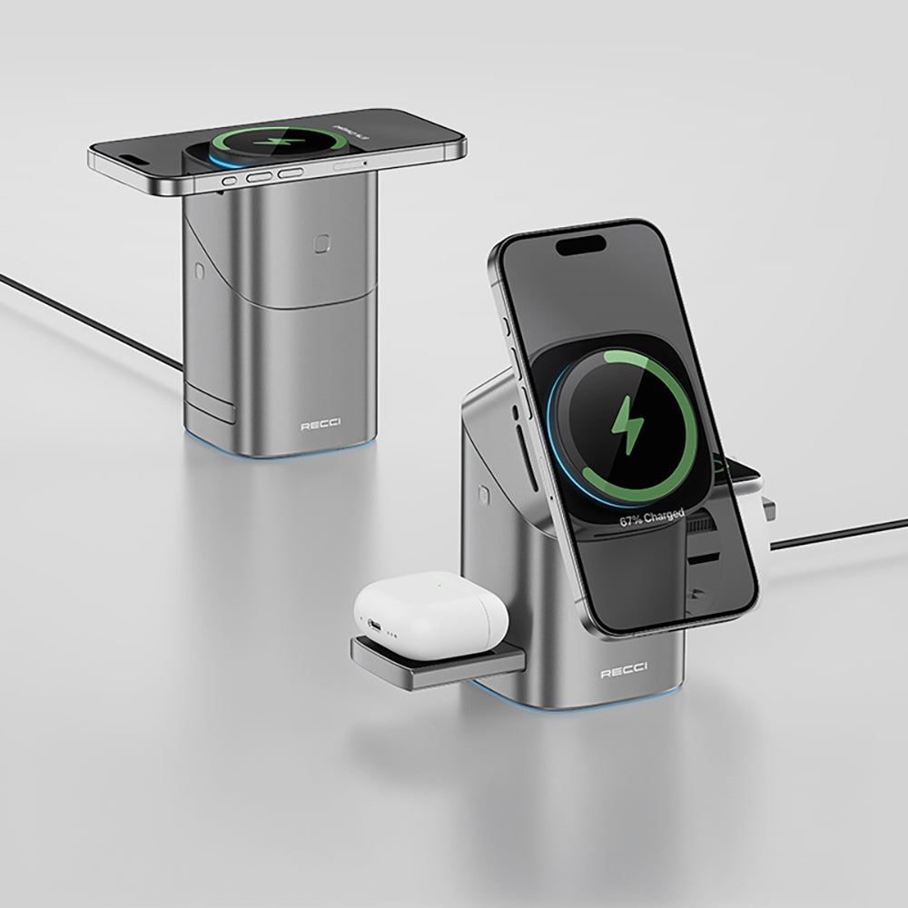 Recci RW05, Qi2 şarj teknolojisi ile donatılmış 3in1 kablosuz şarj standı, iPhone, akıllı saat ve kablosuz kulaklıklarınızı aynı anda şarj etmenize olanak tanır. Güçlü manyetik çekimi sayesinde telefonunuzu tam olarak hizalar ve maksimum şarj verimliliği sunar.