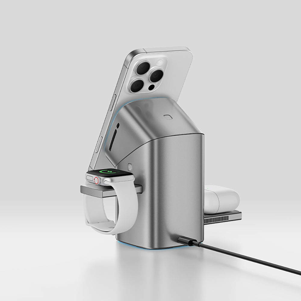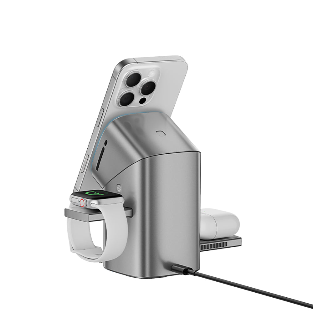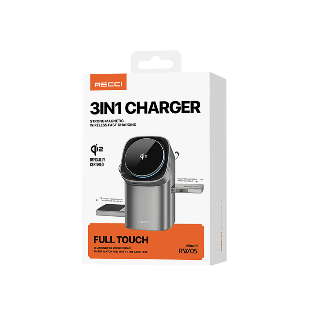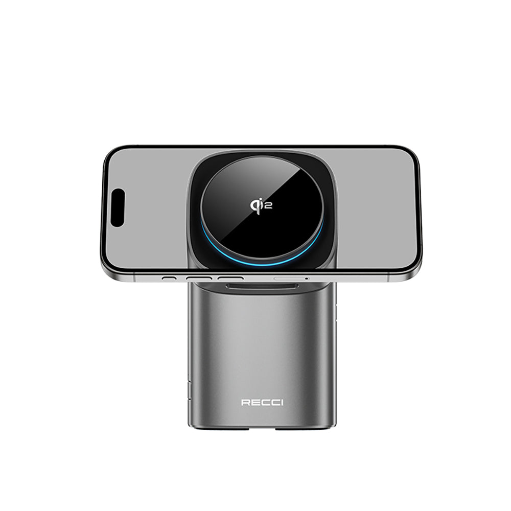 Recci RW05, Qi2 şarj teknolojisi ile donatılmış 3in1 kablosuz şarj standı, iPhone, akıllı saat ve kablosuz kulaklıklarınızı aynı anda şarj etmenize olanak tanır. Güçlü manyetik çekimi sayesinde telefonunuzu tam olarak hizalar ve maksimum şarj verimliliği sunar.