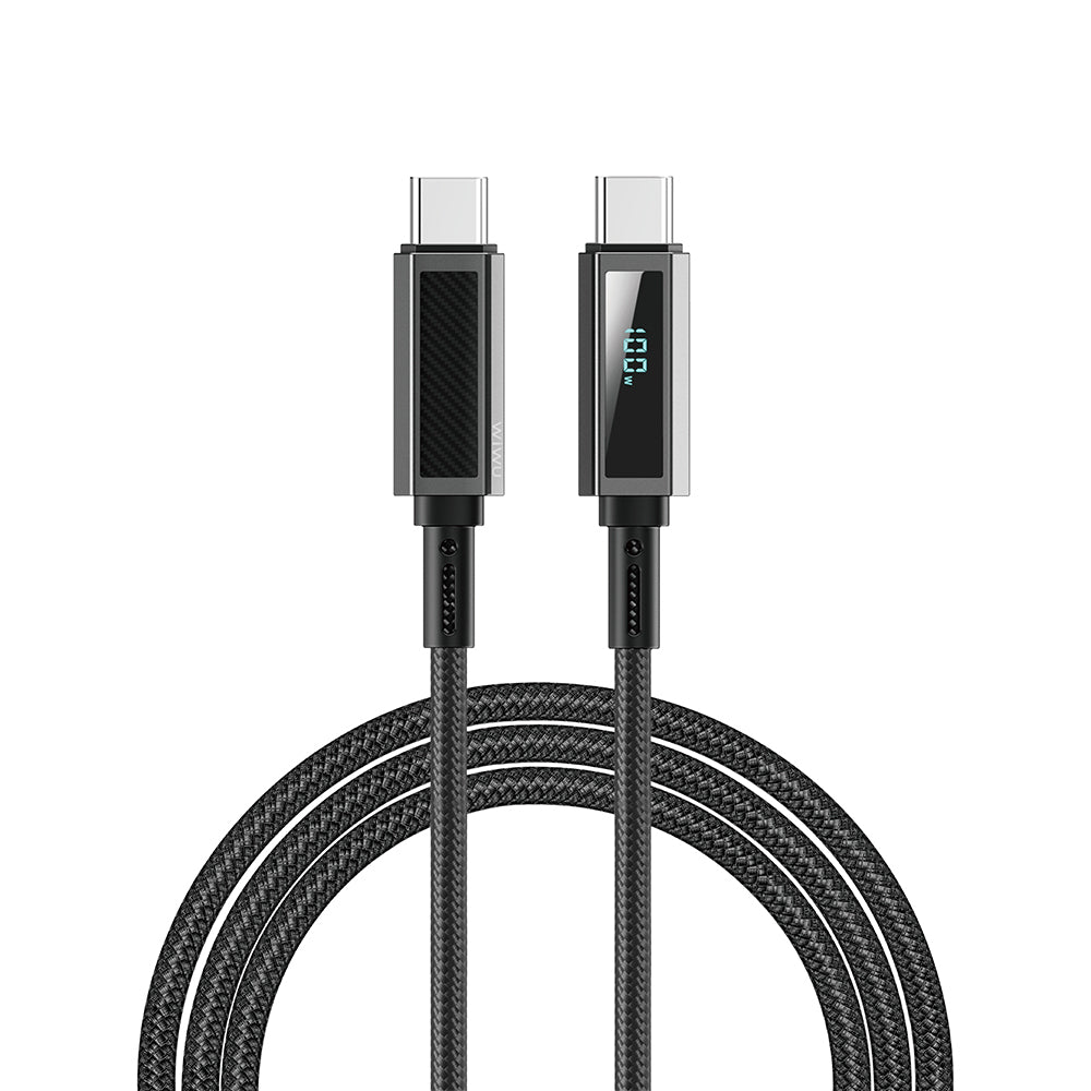 Wiwu Wi-C079 Warriors Serisi Aramid Fiber Dijital LED Göstergeli Type-C to Type-C PD Data ve Şarj Kablosu 100W 1.2M Siyah