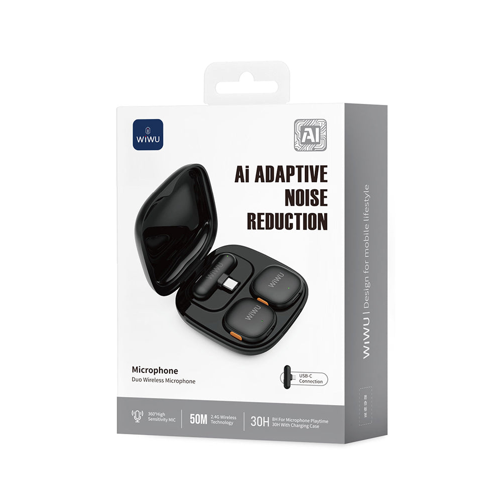 Wiwu Wi-WM006 2in1 Type-C Portlu Yapay Zeka Destekli ANC Özellikli Kablosuz Yaka Mikrofonu Siyah